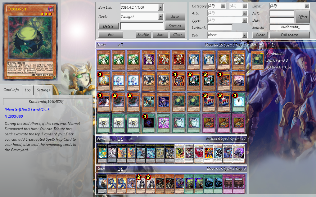 Me pregunté por qué debería usar Card Trooper ó Kuribandit, y no ambos, y no encontré respuesta. Card Trooper es más sólido que el bandido, y el índice de +1 es más alto que el de Kuribandit, además es capaz de matar hasta monstruos de 1900 atk, y eso el amante bandido ni lo sueña. Por eso, decidí jugar 2 copias de cada uno, que supone un índice bien alto de tener un monstruo sólido en primer turno. Así pues, decidí usar Rainbow Kuriboh como una defensa adicional a las 6 que ya van, pero resultaron demasiadas defensas, de modo que me quedé con lo más básico (aún así, reconozco que el Rainbow Kuriboh merece esa rareza y ese precio, porque es realmente bueno). Además, incluí más copias de Wulf, muchas cartas que Kuribandit debía tirar al grave. Resultó ser una tarea que superaba al pobre bandido, de modo que reduje el número de cartas a tirar, y no sólo eso, también incluí Duality, en simbiosis con Kuribandit. Así, quedan como objetivos Wulf (sólo 1, por el tema de la Dualities), Zephyros y Plague.